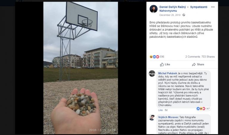 Brno, Jan 3 (BD) –  The photo of the basketball court has been shared hundreds of times on various sites, with many social media users making jokes about its absurdity. It all started with a post in the Facebook group “Sympatizanti Nahovnysmu” by ‎Daniel Daňýk Režný‎, who shared a photo from a children’s basketball court in Brno, in which he holds a handful of the small stones from the surface of the court under the hoop. Režný wrote a sarcastic comment alongside the picture: “Brno is introducing a prototype of the first basketball court with a gravel surface. This will cut down on boring dribbling, and the confused running around will lead to more shooting. Coming soon to all gravel courts (formerly hard-floors) at basketball stadiums.”