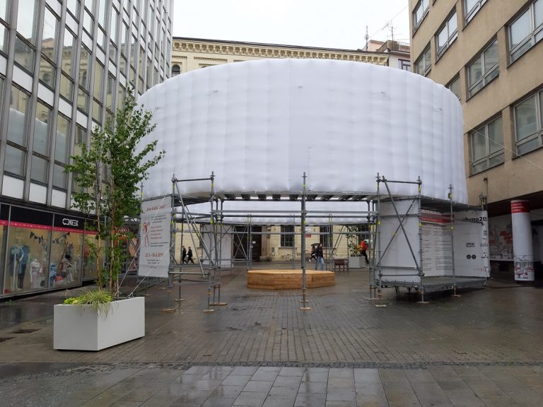 Brno, May 30 (BD) – The installation opened on May 25 in the empty space behind the Centrum building near Malinovského náměstí, known as Pohořelec. Lectures and screenings will take place here in the afternoon and evening hours, touching on the environment, housing or even sports. As well as the normal furniture, the structure designed by “Architects for Pohořelec” includes an unusual “inflatable”.