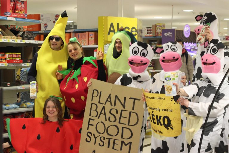 Brno, Mar 12 (BD) – According to news outlet Brněnský deník, the ‘party’ ended after a few minutes with the arrival of the police, who negotiated with the activists to finish their action without any intervention. “The whole event took place in a positive atmosphere; passers-by stopped to photograph the dancing fruit, and smiles appeared on the faces of the staff. Upon their departure, they bought some oat milk,” wrote organizers from Animal Rebellion Česká Republika on Facebook after the event.