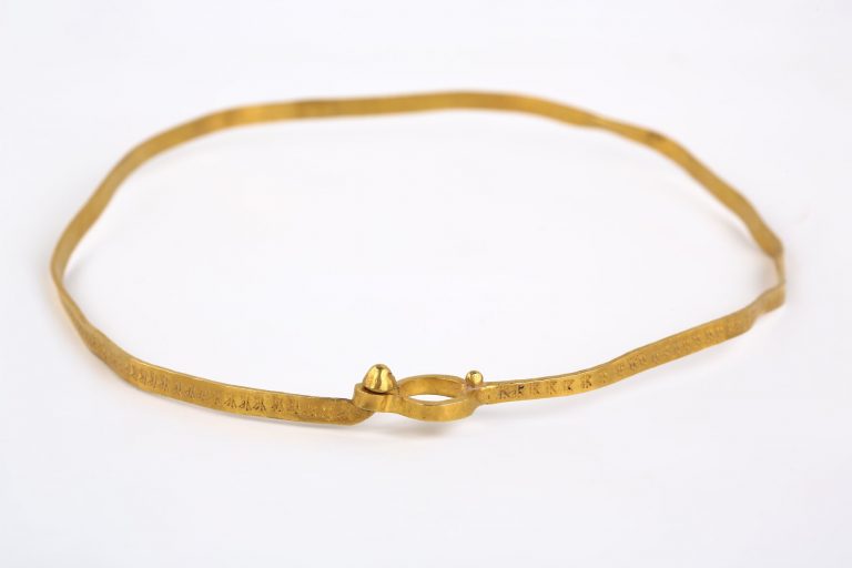 The discovered necklace, weighing 32 grams, had a pear-shaped fastener at one end and a button at the other. It was made of a thin flattened gold ribbon and decorated with an irregular stamped ornament. Orientation measurements showed a purity of 900/1000, with a slight admixture of silver and copper. The discovery was unusual, considering it took place in the territory of the so-called Central European barbarian.