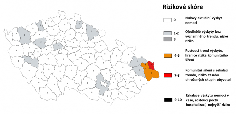 Each district is given a score out of ten evaluating the local risk of transmission, which corresponds to one of six colours, from white (negligible risk) to black (very high risk, including community transmission and rising number of hospitalisations). Currently, all districts in the Czech Republic are at a very low risk of infection, apart from three districts at the far eastern end of the country near the Polish border, around the mining town of Karvina.