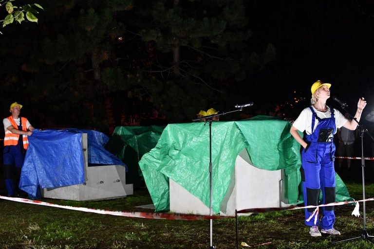 “We proceeded from the life story of Adolf Loos, who designed his own grave in the form of a granite cube before his death,” explained the authors, sculptor Oldřich Morys and architect Jaroslav Sedlák, who were also cast in the mini-play.