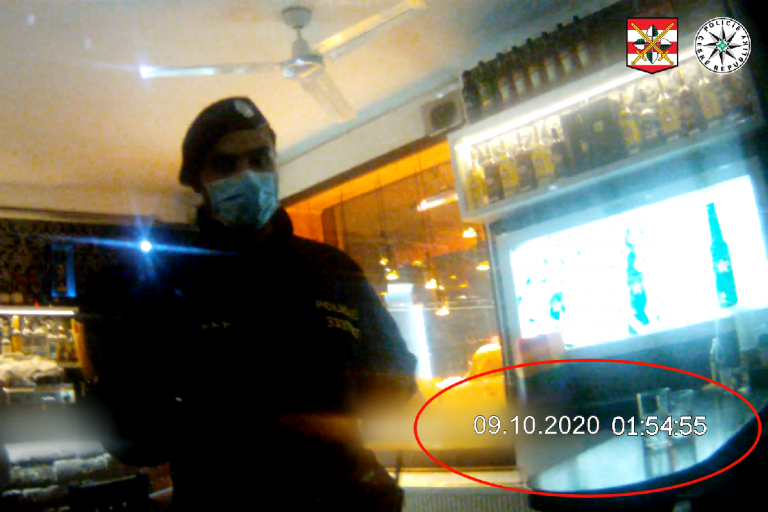 Brno City Police officers discovered an establishment still open at 2am during night patrols. The bar was playing loud music, and customers without facemasks quickly left the establishment. The owner is facing administrative proceedings. Photo credit: Police CR Video.