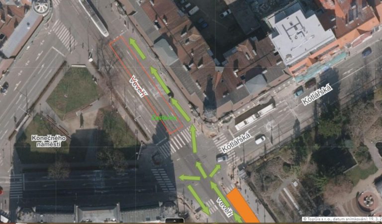 Transport restrictions will apply on Veveří until December 18th and on Benešova from November 21st-22nd. Meanwhile, Bohunická has reopened after extensive works. After more than a year of reconstruction work on the water supply and sewerage system, cars can now pass freely and public transport has resumed. Image: Map of the situation behind the intersection Veveří x Kotlářská x Konečné náměstí. Credit: Kopemezabrno.cz (“We Dig For Brno”).
