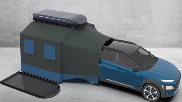 The ‘Advanture packet’ is a camping tent which fits on the roof of a car. The design is compact and biodegradable, and additional solar panels on the roof box power other tent accessories.