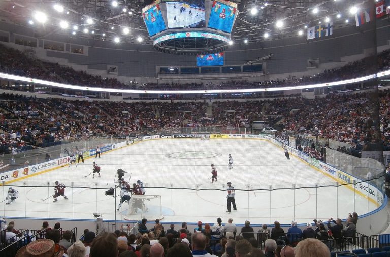 The Czech carmaker Škoda Auto has announced that it will not sponsor this year’s Ice Hockey World Championships, part of which are due to be held in Belarus, due to concerns over human rights. The International Ice Hockey Federation is considering Denmark or Slovakia as alternative locations for the championships. Photo: Minsk Arena in Belarus, Finland v.s. Latvia in May 2014. Credit: By Pjotr Mahhonin – Own work, via Wikimedia Commons under license CC BY-SA 4.0.