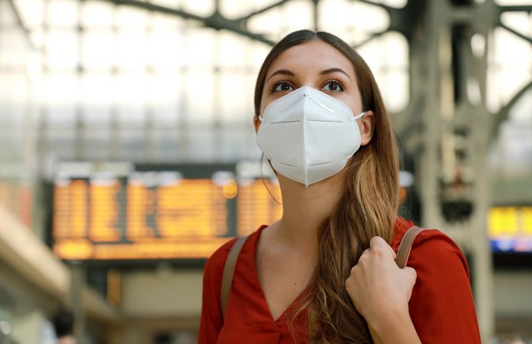 It's time to go back to travel. Close up of traveler girl wearing KN95 FFP2 face mask at train station. Young caucasian woman with timetables information of departures arrivals on behind.