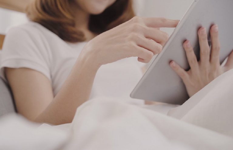 Young Asian woman using tablet while lying on bed after wake up in the morning, Beautiful attractive Japanese girl smiling relax in bedroom at home. Enjoying time lifestyle women at home concept.