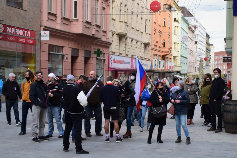 Brno, March 15 (BD) – On Sunday afternoon, approximately 100 people gathered around Zelný Trh in Brno, mainly in response to Manifest.cz’s call for a demonstration against the current anti-epidemic measures imposed by the government. The police dispersed the crowd 20 minutes after the demonstration started, and the protesters marched through the center of Brno for approximately another hour and a half, accompanied by police cars. Brno Police were informed in advance about the planned demonstration and blocked all the access roads into Zelný Trh, asking for proof of identification from those wishing to enter the square.
