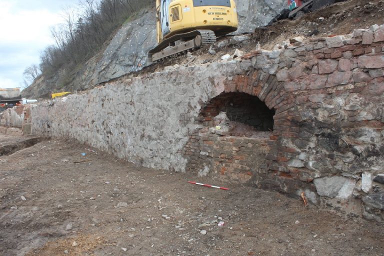 Excavations carried out for the construction project on Žabovřeská have uncovered the remains of the Kamenný mlýn settlement, built in the 19th century around the original medieval mill. Construction of Kamenný mlýn stopped when work began on the road from Pisárky to Komín, and only a small chapel has survived. Photo Credit: Archaia Brno.