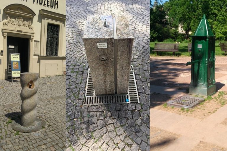 The map was developed as a result of cooperation between the municipality and Brno students, and includes water fountains managed by city districts, the Brno Green Spaces organization, and private businesses. Photo: Drinking fountains by Petrov, Koliste and Luzanky (from left to right). Photo credit: MMB.
