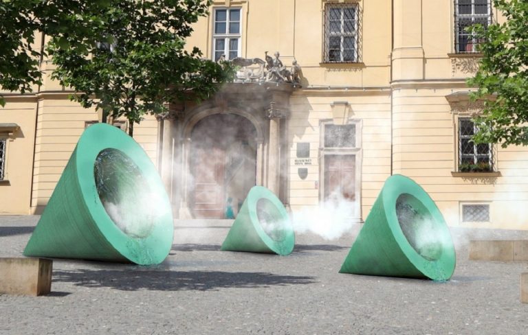 “The shortlisted entries represented different approaches: minimalism, figural realization, geometric abstraction, and decorative postmodernism,” added Monika Lukášová Spilková, Chair of the Brno City Council Commission  “The winning design was also my favorite. It is based on geometric abstraction, the objects of the three cones resemble the outlet of a pipe as if from an infinite perspective and thus actually violate the geometry and break up the space. As the square is accessible from all sides, the installation will offer a different visual impression or effect from every angle.”