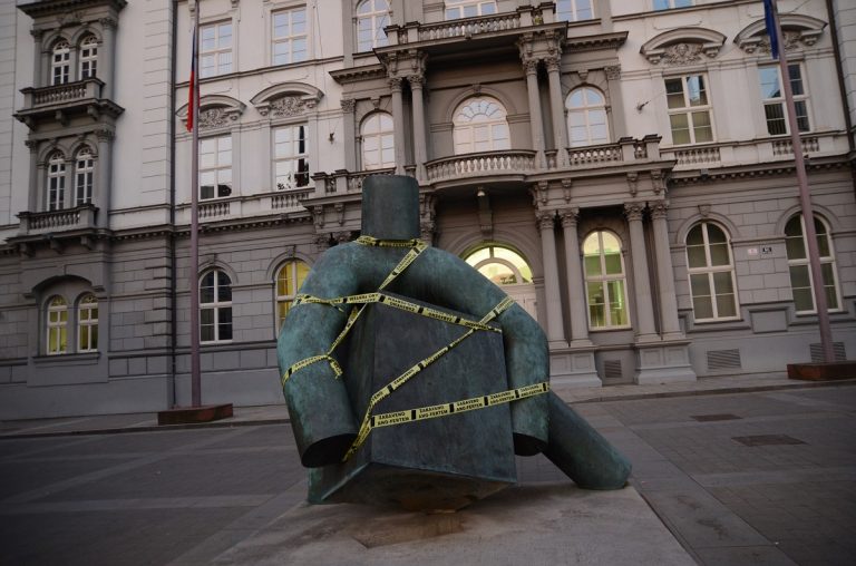 Yellow-back tape bearing the message “Confiscated by ANO-fert” was used to mark public places in about 30 Czech cities, including Brno. Photo: Million Moments for Democracy via Facebook.