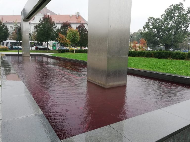 In addition to the blood red that stained the structures, both fountains bore banners with the inscription “IDET Brno” stained with blood.