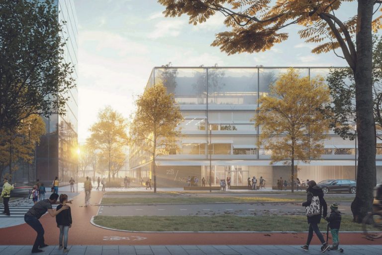 The winning design by the SOA architekti features three new buildings, surrounded by a large public space with maximum accessibility for pedestrians. The school’s garden and sports area is designed to interact with the life of the new district’s residents, and the complex of studios, clubhouses and roof terraces on the fourth floor will be accessible separately from the main street, and can therefore be used for extracurricular activities independently of the operation of the school itself.