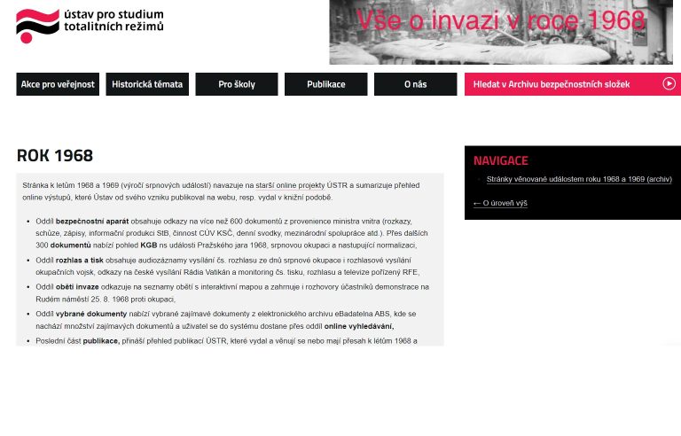 The portal presents materials on years 1968 and 1969 that the USTR has published or released online since its foundation in 2008. It is more than 100,000 pages of online documents that have become available to the broad public on occasion of the 55th anniversary of the invasion that was followed by 21 years of occupation of the country by the Soviet army.