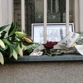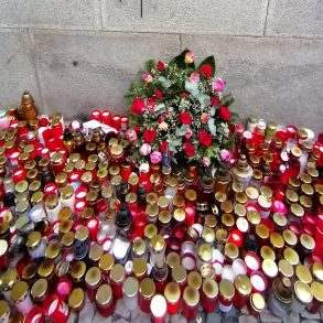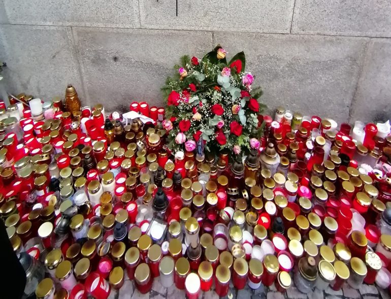 Thousands of candles cover the entrance to the Karolinum UK administrative building, alongside flowers, stuffed animals, messages for the victims and photographs. The candles are to be removed from the memorial site on Friday morning, and will be turned into a permanent memorial of the tragedy.