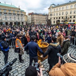 People gathered at the university rector’s seat on Ovocny trh, and set off down Celetna at around 2pm to Jan Palach Square. The march was headed by Charles University Rector Milena Kralickova and FF UK dean Eva Leheckova, carrying lanterns with a light from the memorial site.