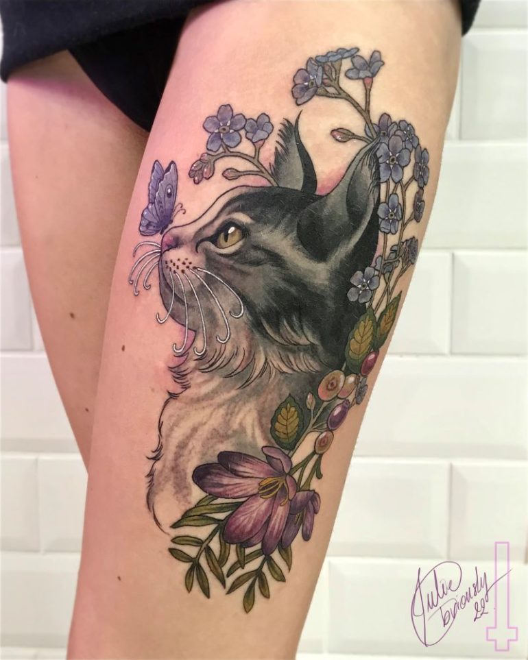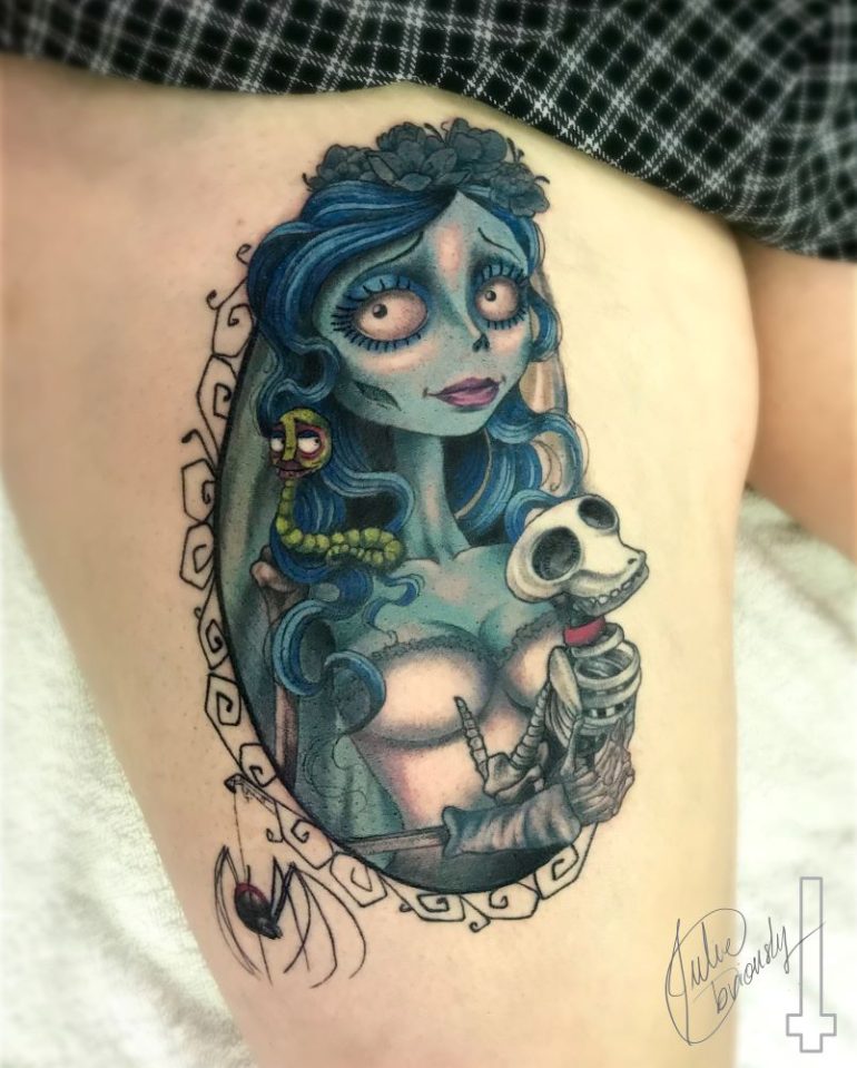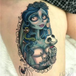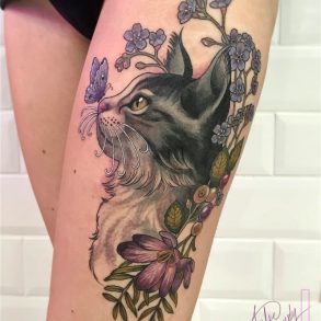 I like almost all of them equally but my favourites would have to be a portrait of a woman on my arm by Lolie Kiwi, a French artist. It’s a tattoo that helped me through a grieving process. My second would be a composition from the film “Leon the Professional”, on my hip, by my colleague Bratr Vira. There’s a crazy story behind this tattoo, probably too long to talk about here!