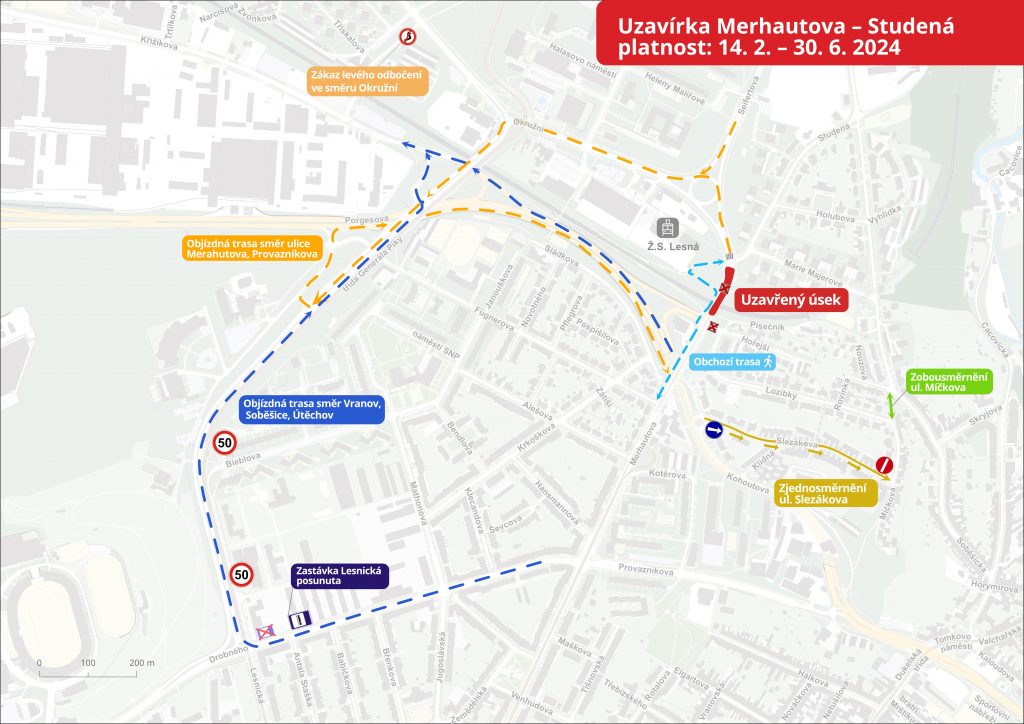 From 14 February to 30 June, the bridge on Merhautová over the railway line to Lesná will be completely closed, specifically in the section from Hořejší–Studená. Detour routes lead along Provazníkova/Porgesova and Generála Píky avenue in the direction of Soběšice, Útěchov and Vranov. In the direction of Merhautova and Provazníkova, drivers should use Okružní, Generála Píky and Porgesova. At the same time, Míčkova will be rerouted in the Buchtova–Lozíbky section, Slezákova will be one-way in the Míčkova–Kohoutova section, and left turns from Třískalova to Okružní will be prohibited.