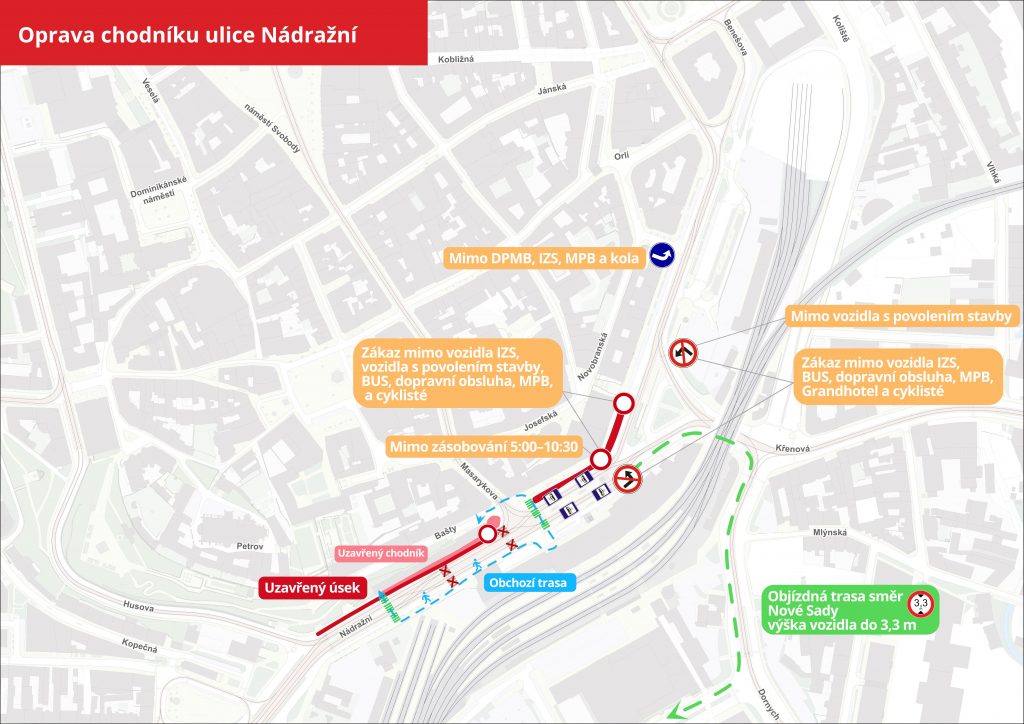 Meanwhile Nádražní road will be closed in the Benešova–Husova section (under Bašty Street) in the direction of Benešova, from next Monday, 19 February, until 31 May, due to pavement repairs. The work will also affect pedestrians, as part of the sidewalk in the section between Masaryková and Husová will remain closed. This closure will proceed according to the development of the construction. The part of the sidewalk that will be closed when the work begins is shown on the map below. Some crossings at Nádražní will also remain closed. In the next stages, the restrictions may change, and those using the area should follow the traffic signs.