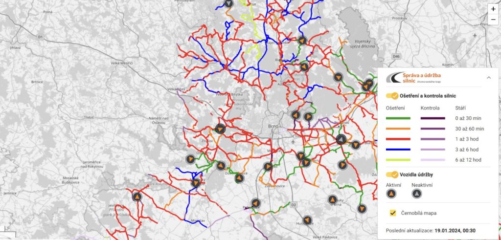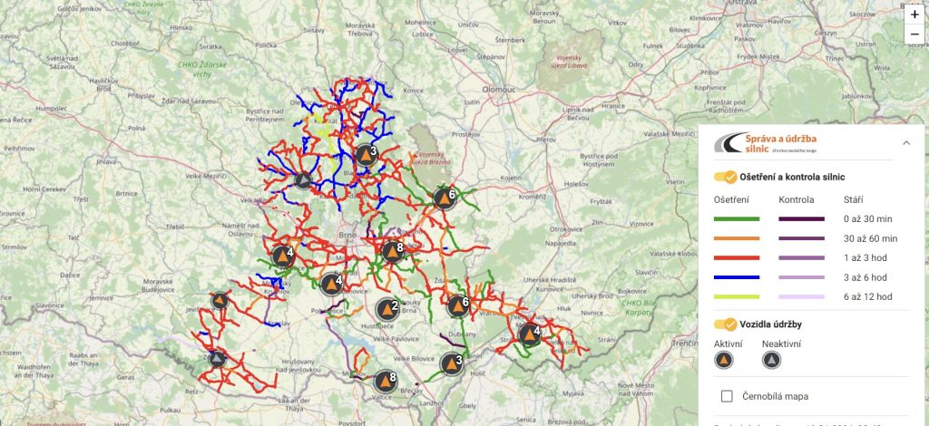 “It’s the first step for people to have an overview of the work of our road workers and to be able to see what is currently being done,” said regional governor Jan Grolich. “The shape is not yet final and it will keep moving. Work is being done to make the winter maintenance plan appear on the map, so that you can see the treated sections according to importance, and also which parts of the roads are not being maintained. In the summer, mowing along the roadside and the location of vehicles performing routine maintenance could also be reflected in the map.”