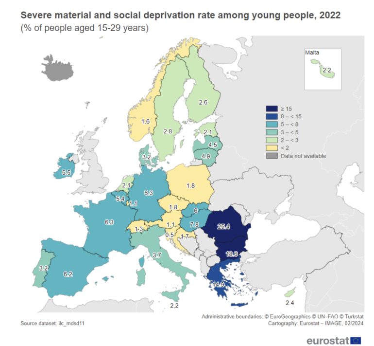 The highest proportions of young people encountering severe material and social deprivation in 2022 were found in Romania (25%), Bulgaria (19%), and Greece (15%).