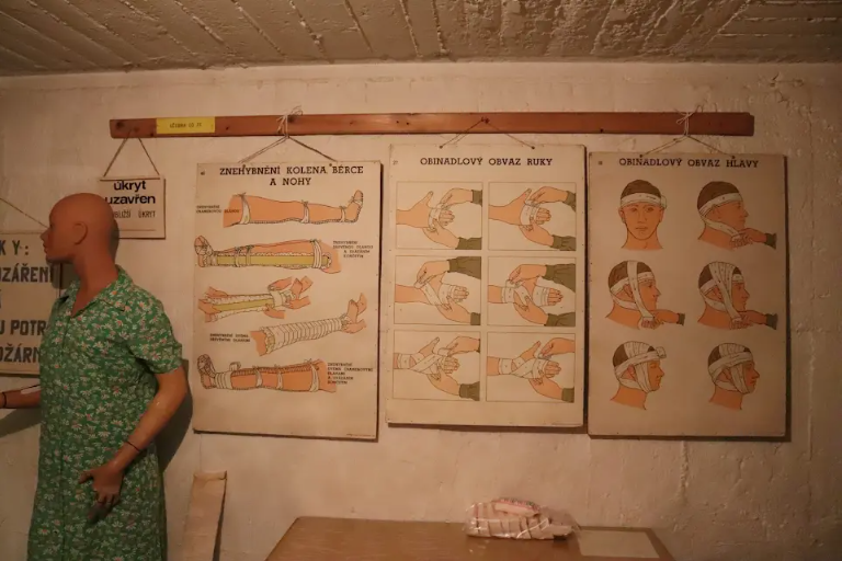 “The original equipment has been preserved, including maps, records, and communication equipment,” said museology student Simona Maděránková, who participated in the preparation of the exhibition. “The guided tour starts in the cloakroom area, continues through the gas antechamber originally intended for hygiene, followed by the rooms for those in hiding and the command staff.” She added that visitors can try providing first aid according to contemporary instructional panels, as well as other interactive elements.