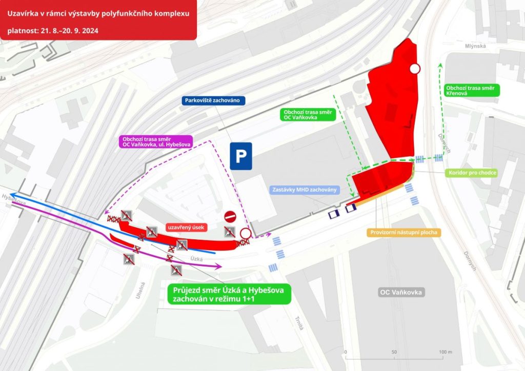 In the second stage, starting on 21 August and lasting until 20 September, in addition to the measures mentioned above, the sidewalk on Dornych will also be closed, from the pedestrian crossing at the viaduct next to the underpass, to the intersection with Úzká. Pedestrians should use the other side of Dornych. The crossing near the intersection with Úzka will remain in operation.