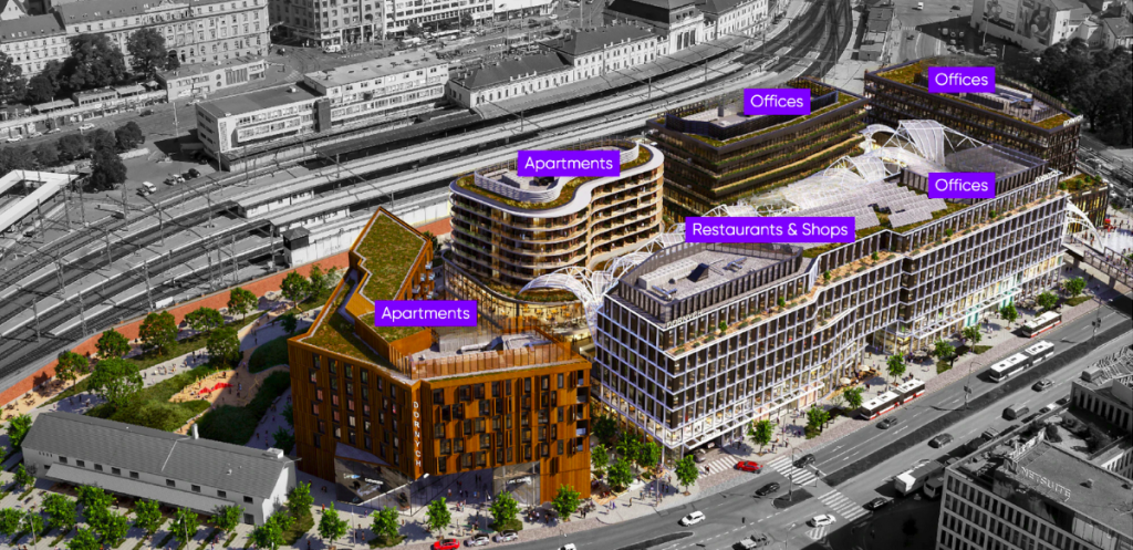 Six buildings, the tallest of which will have eight floors, will be constructed on the site, together with a partially covered public space. The underpass connection to the main station and the footbridge over Úzka will remain. The development will contain 186 rental apartments, 26,000 square metres of office space, and 27,000 square metres of retail space.