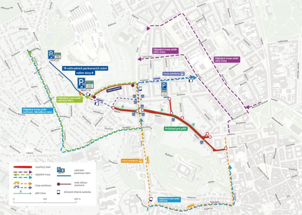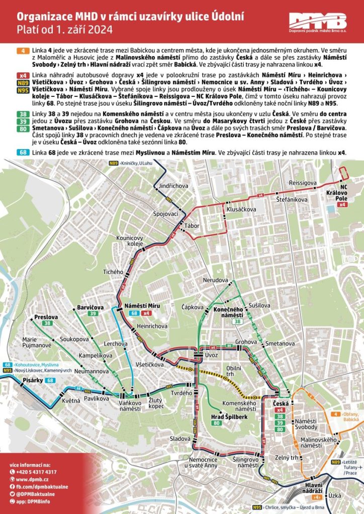 During the reconstruction, the street will be completely closed to private and public transport vehicles. Tram line 4 will be replaced by bus line x4, and trolleybus lines 38 and 39 will terminate at Česká instead of Komenského náměstí. More detailed information on public transport measures can be found in the map below.