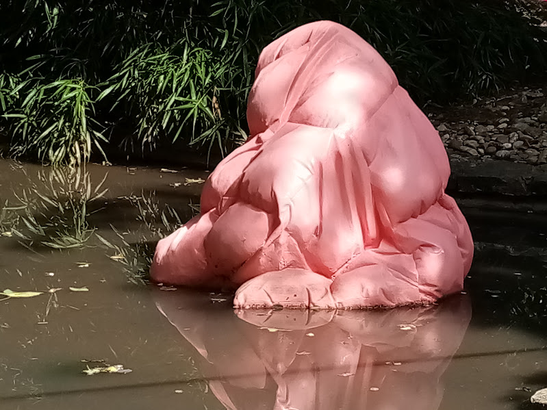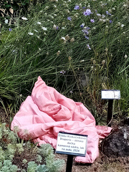 Sometimes the works seem completely out of place and incongruous. This can be part of the meaning. Like Valerie Moravcová’s Peřina (Duvet) which is placed in the formal Japanese pool. It has the realistically billowing shape and look of a dropped duvet. The pink colour adds to the light humour and absurdist quality of this object in the water. It is a duvet out of its normal element. It is off the bed. It’s a fish out of water!