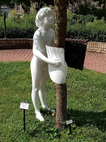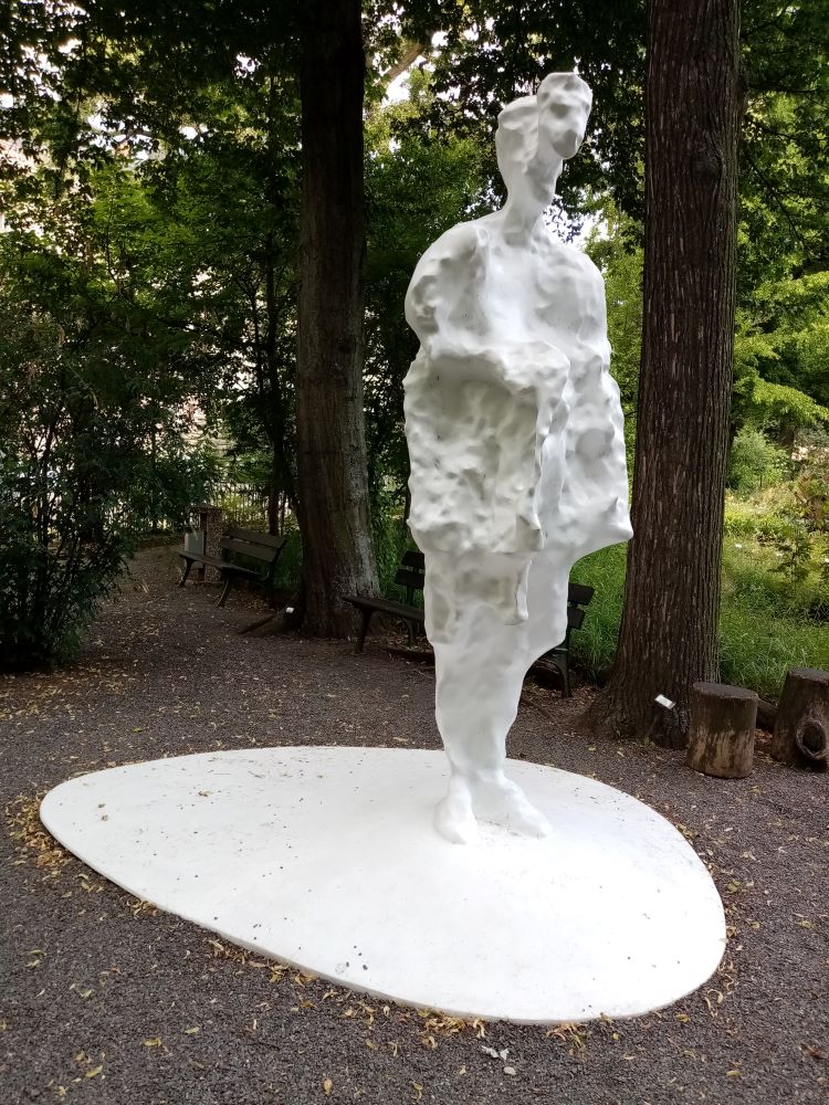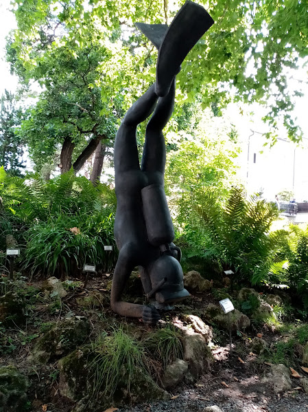 Occasionally the placing of the sculpture is part of its quixotic meaning, like Potápěč (Diver) by Eliška Jedličková. It’s a surreal delight to see the flippers dangling up to the trees and the sky. This is a wonderful technically skilled piece. The weight of the upside down human form balances on the diver’s elbows. The spine is slightly curved, and the flippers cleverly capture a sense of these half human, half marine shapes being moved by a swell of water.