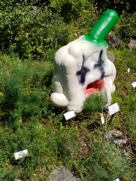 Perhaps one of the most startling and provocative pieces is Klaun (Clown) by Andrea Krnáčová. It is a scary clown, with traditionally marked eyes, but these are spray painted quite roughly, and not carefully outlined. His body is truncated to just the face. Klaun has a vivid red, gaping open square mouth, and a hat shaped like a partially erect penis, painted bright green. It is positioned above a serene little pond, and in contrast is loud and attention grabbing. The phallic hat is both menacing and ridiculous. Aggressor and also victim? The power of the piece lies in this ambivalence.