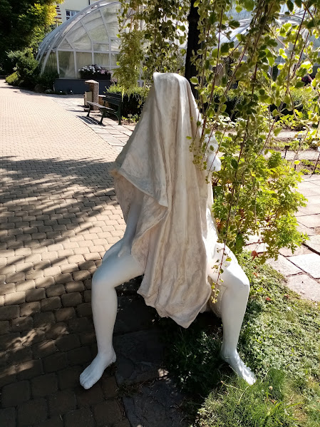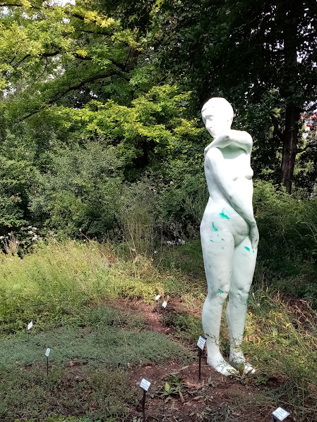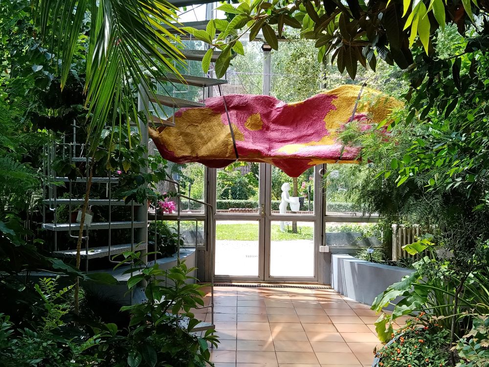 Another work by the same artist, Temcsáková, is situated nearby in the greenhouse. It is called Paměť těla (Body Memory) and is made of Paper Mache. It is an enlarged version of a piece from the previous year which was placed outdoors, but suffered damage from being exposed to the elements. This highlights one obvious disadvantage to garden settings – fragile materials are at risk.