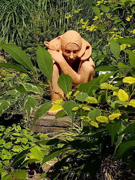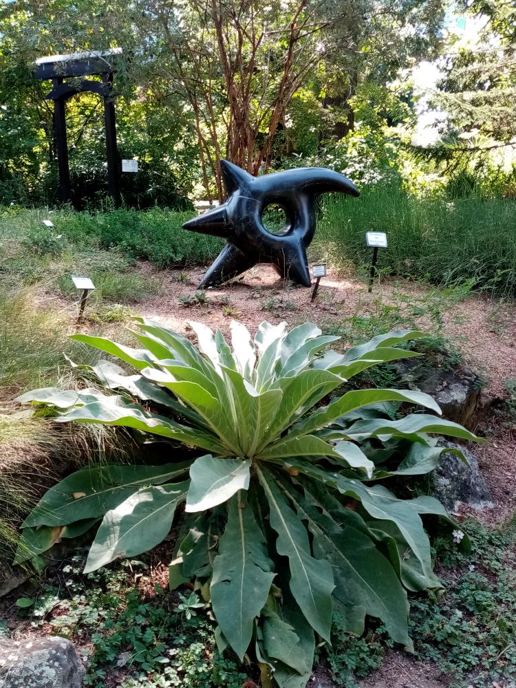 Depending on the angle, and the time of day, the negative spaces of this work produce deep and dramatic shadows, almost theatrical among the lush greenery of the garden. It is a very pleasing piece, which we can see almost in the round.