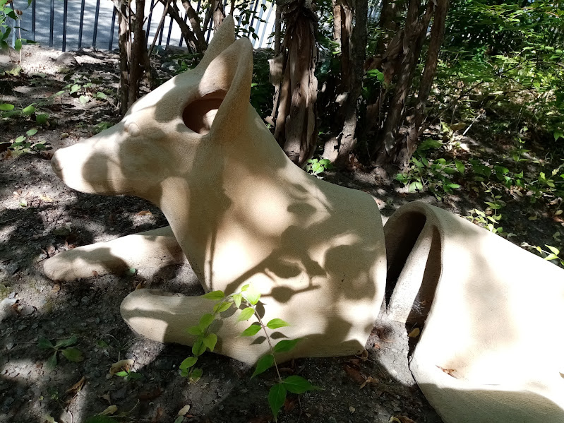 Pasta creates relationships with its surroundings. The vertical, still growing massive trunks of the trees behind it both mourn and celebrate Pasta’s prone shape. The old cement frog at the top of the pool tries to commune in water with this upstart newcomer, and Pasta’s architectural cousins, the curving greenhouses behind it, watch over, admire and echo it.