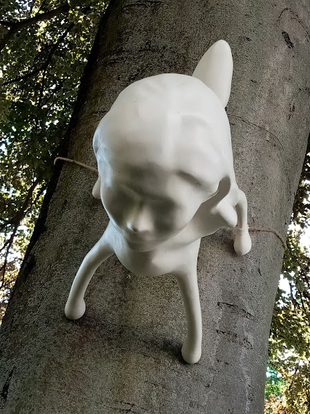 Tomáš Zdvořáček has chosen possibly the most ambitious, unconventional and brave placement for his sculpture Parazit (Parasite). This is facing downwards, along the trunk of an old tree. His white 3-D printed, part human, part animal, part mythological, part Disney-like creature is secured with multiple cable ties and ropes.