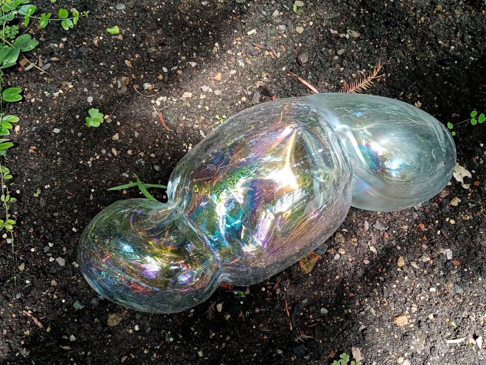 In Bubble, by Pavlína Temcsáková, sunlight is again an integral feature of the work. It transforms the organic, repeated shape into a magical holder of prismatic light. Placed lying on the soil, Bubble is like a transparent caterpillar, which is simultaneously also a beautiful chrysalis.