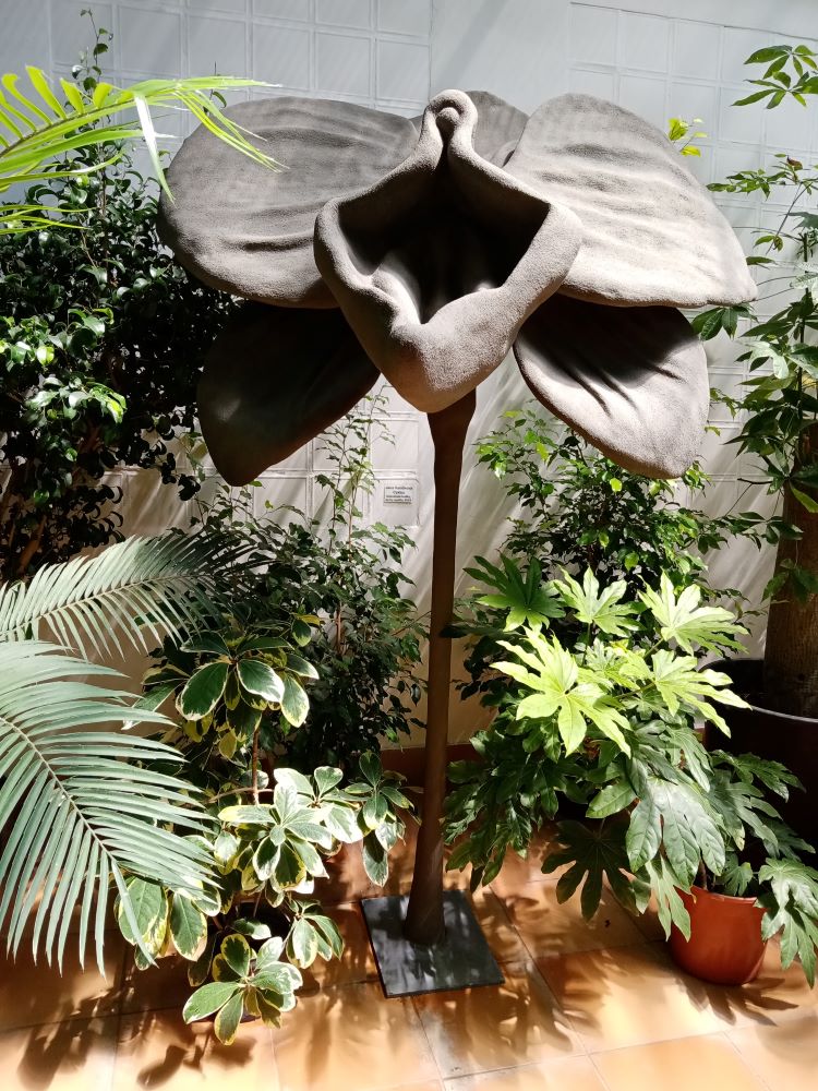 Another two works are placed in the greenhouse. One is called Cyklus (Cycle), by Jana Vašíčková. This piece is made of pipes, wire, glues and what looks like cement. The monochromatic grey colour of the piece contrasts with all the bright foliage surrounding it. Nevertheless, the exotic outsize bloom which looks slightly vaginal, or a bit like a predatory mouth, has a voluptuous Georgia O’Keefe quality to it. It’s a brave work, welding a geometric stalk to a sumptuous, organic corolla of petals. It is cleverly placed among plants in pots.