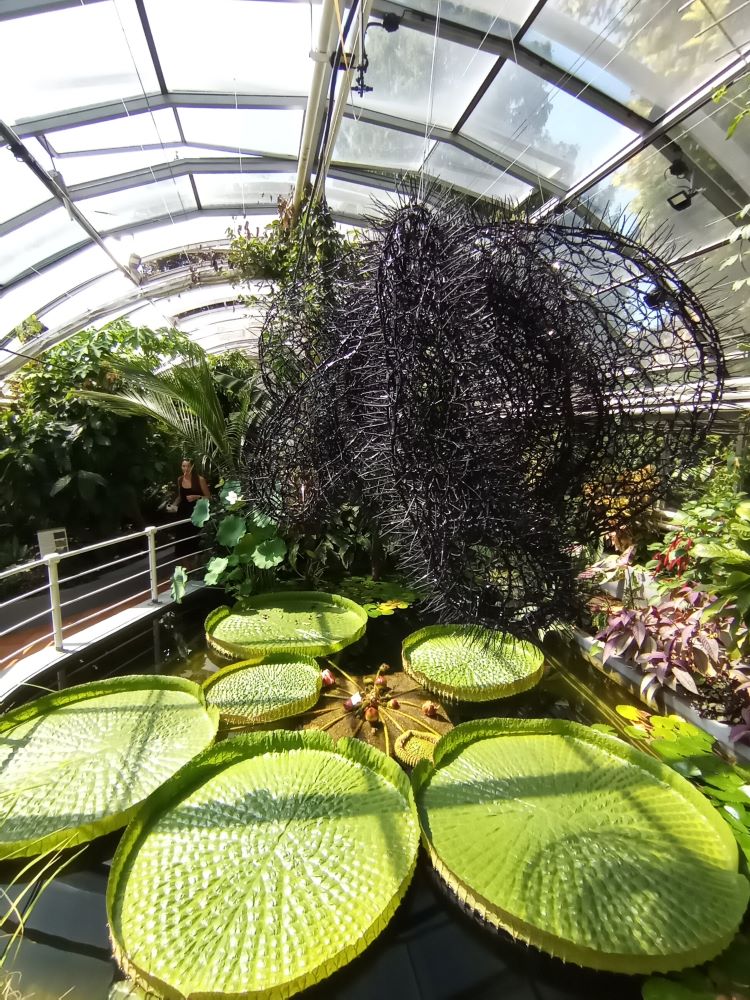 The other work in the greenhouse is by one of the tutors, Tomáš Medek. It is called Manifold, which refers to a mathematical concept of describing a difficult shape in a simple way. It is like the way a flat map refers to the spherical earth. Here the intertwining metallic netting with spikes, weaves in and out of itself. This very cerebral creation hangs poised above a horizontal group of giant lily pads in a pond.