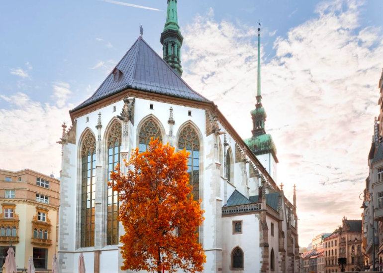 For the second part, a guide will take visitors to the 43-metre viewpoint in the church tower. The climb, which is physically demanding because of the narrow stairs, leads to a panoramic view of Brno, including Špilberk and namesti Svobody.