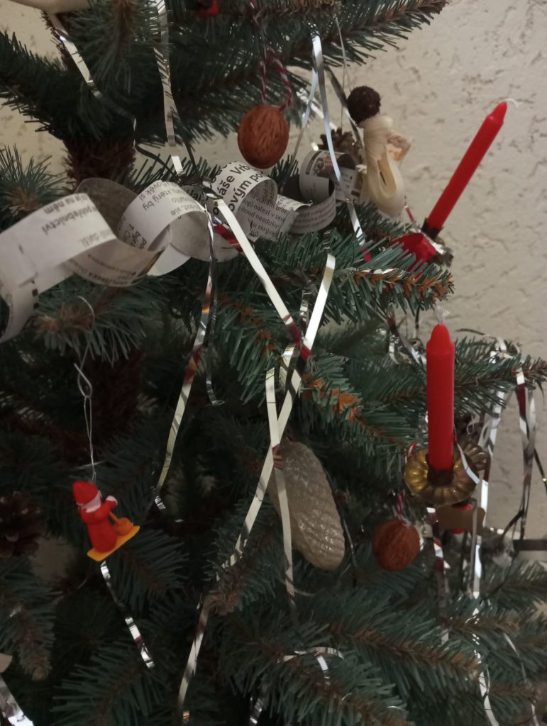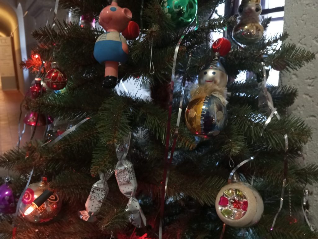 For the Christmas tree representing the 1940s, for example, the first thing that draws the viewer’s attention is the paper chain and pinecones. The decade was deeply influenced by the hardships of World War II and the recovery period, and the material shortages were therefore reflected even in the tree decorations. Simple and modest handmade decorations covered the tree, as things like dried fruits or even sweets were considered luxuries. Even though there was an ongoing prohibition under the Nazi-administered Protectorate against the public Christmas tree and charity donations, people still had them as a symbol of resistance.