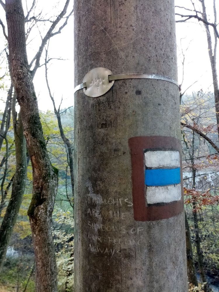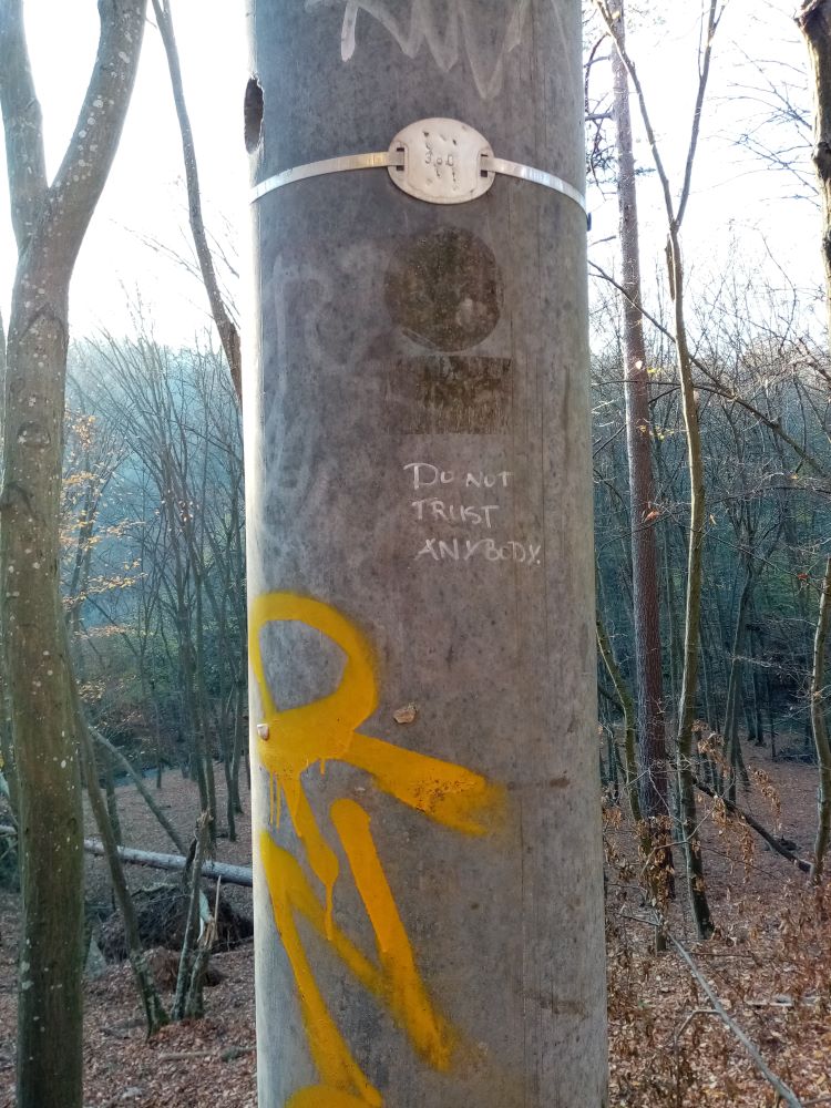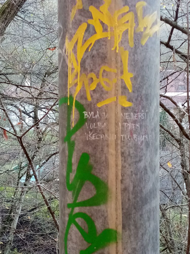 The words are often written in close proximity to other signage on the poles. These include the iconic blue and white Czech hiking trail markers, some painted calligraphic graffiti, and number-punched metal plaques which circle the poles like bracelets.