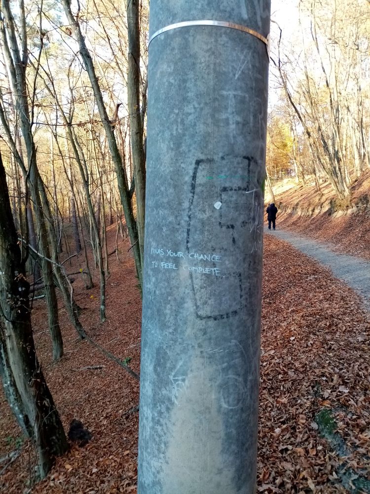 Each part requires some searching. It is not easily visible to every stroller, although its placement along the path seems to indicate that the writer intends, and needs for it to be read. Sometimes you have to walk partially around the pole to read the full message.