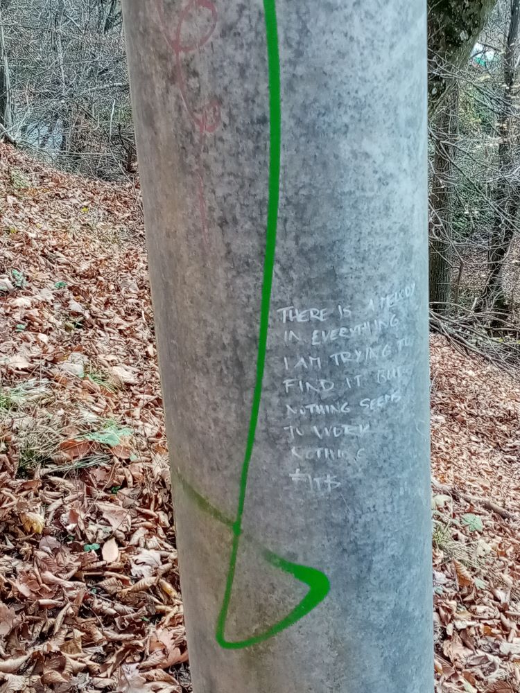 Did the musician finally compose something? And why write with permanent marker instead of something thicker, more enduring? And why choose electricity poles as the parchment?