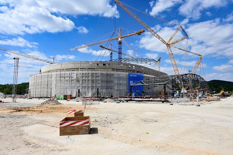 The installation of the roof involves four heavy lifts of individual parts that were assembled in advance on site. “Because these are really large and heavy steel pieces of the roof structure, it was necessary to ensure sufficient equipment,” explained Petr Kratochvíl, chair of the Board of Directors of Arena Brno. “Finally, the largest crane in Europe arrived in Brno, which has a lifting capacity of 750 tons and a height of up to 196 meters, and will safely transport the individual parts to the frame of the building.”