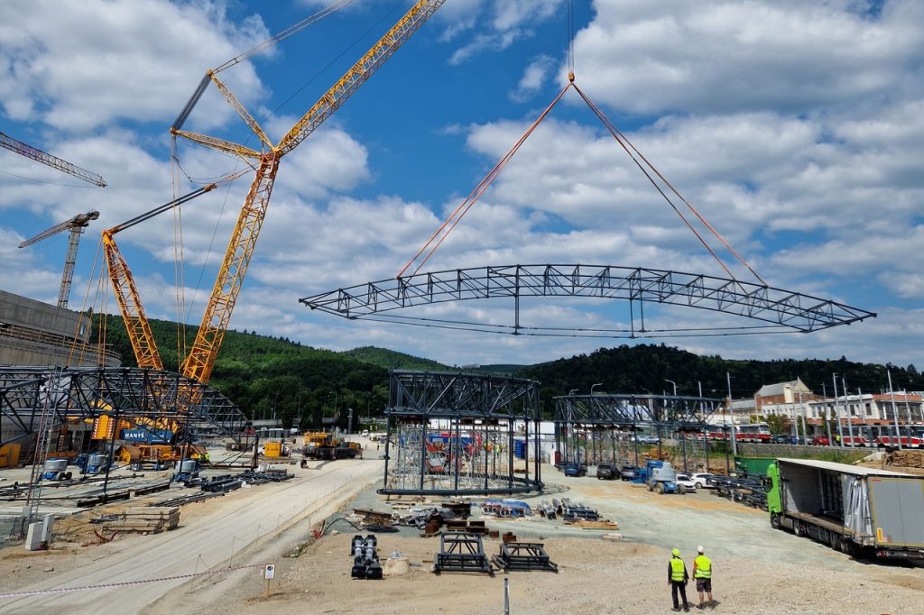 Yesterday, 12 May, the long-awaited and carefully prepared installation began of the roof frame for the new multi-purpose Arena Brno at Brno Exhibition Centre. Due to the size and weight of the individual elements, the builders had to call in the largest crane in Europe, which has a lifting capacity of 750 tons.