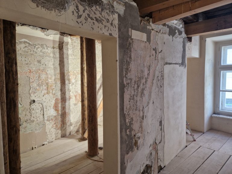 More serious static defects discovered during the reconstruction caused the interruption of building works; only restorers are working on the site. The project is now to be adjusted based on the new information. The updated plans, which should be ready in the coming months, will also preserve the newly discovered artistic decoration, with implications for the future use of the building.