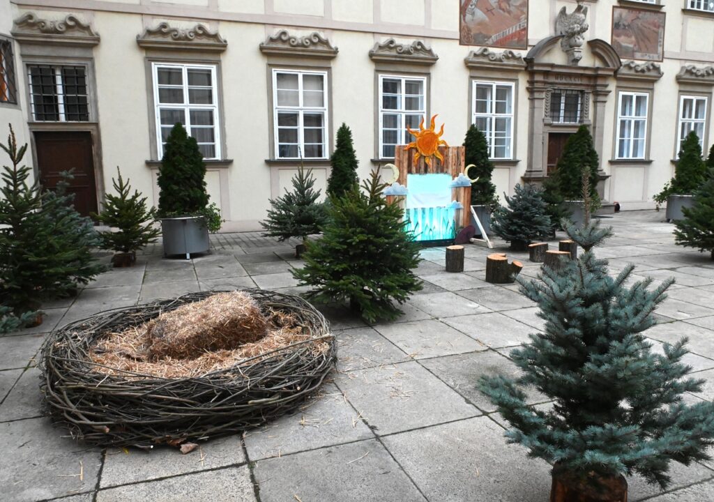 Another nativity scene, this time from the workshop of the sculptor Tomiš Zedník, can be seen in the courtyard of the town hall of the Brno-střed district. It includes hand-carved shepherds, sheep, and baby Jesus in a manger. This year, the scene has been expanded to include a lumberjack, a goose, a pig, and other novelties, and will also include interactive game elements.